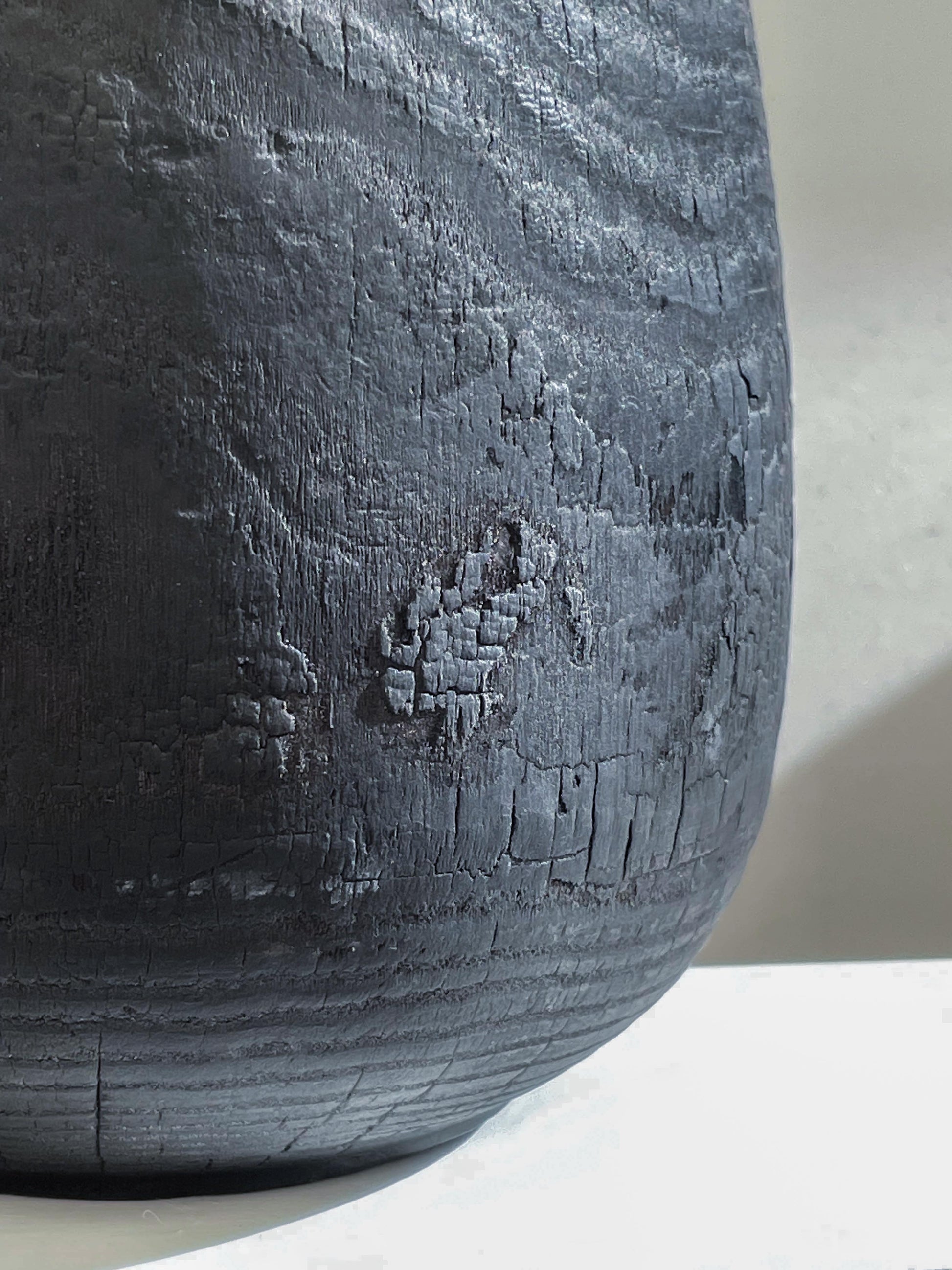 This 'found wood' bottle shape sculpture has a heavily burnt finish using a traditional Japanese method of wood preservation called yakisugi.