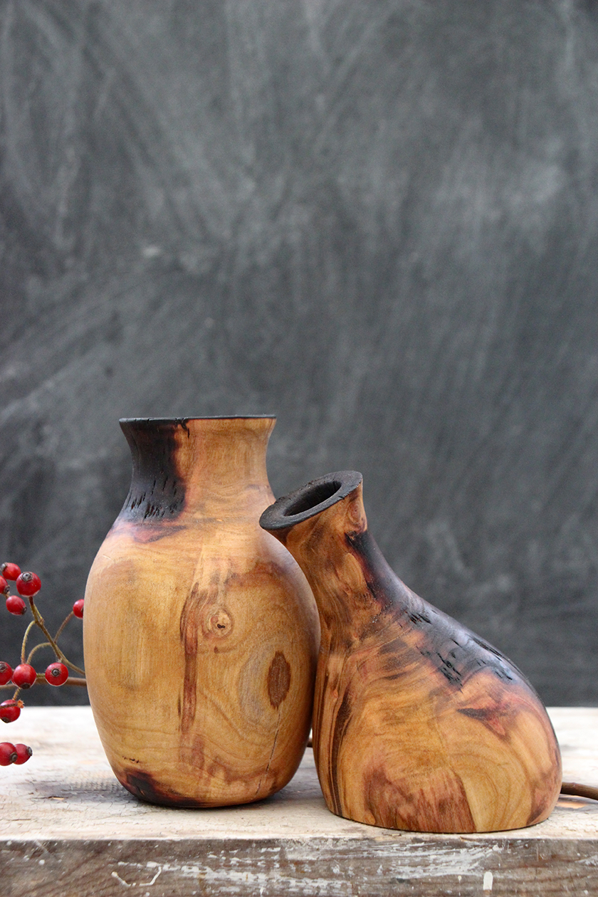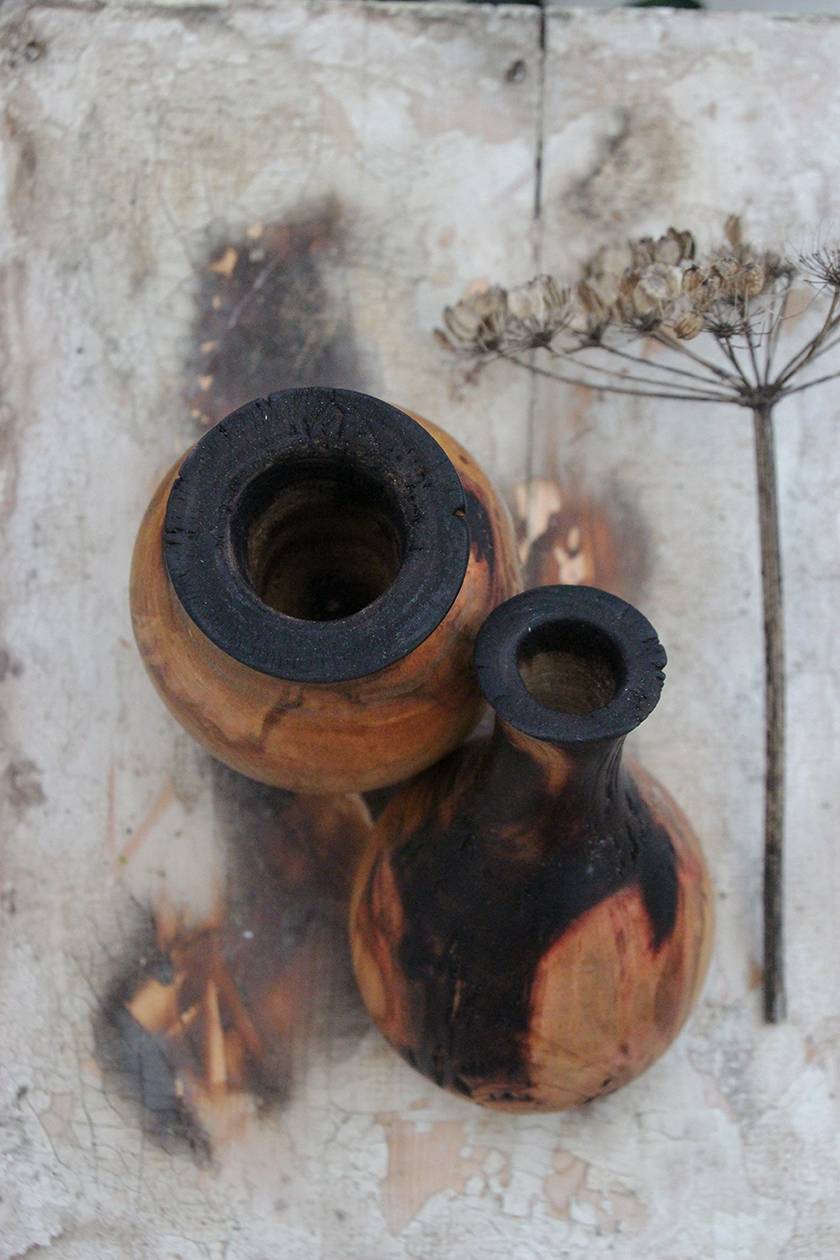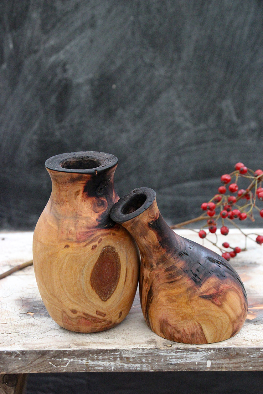 Partially fire treated cherry bottle couple that seem to hug and lean in to each other.