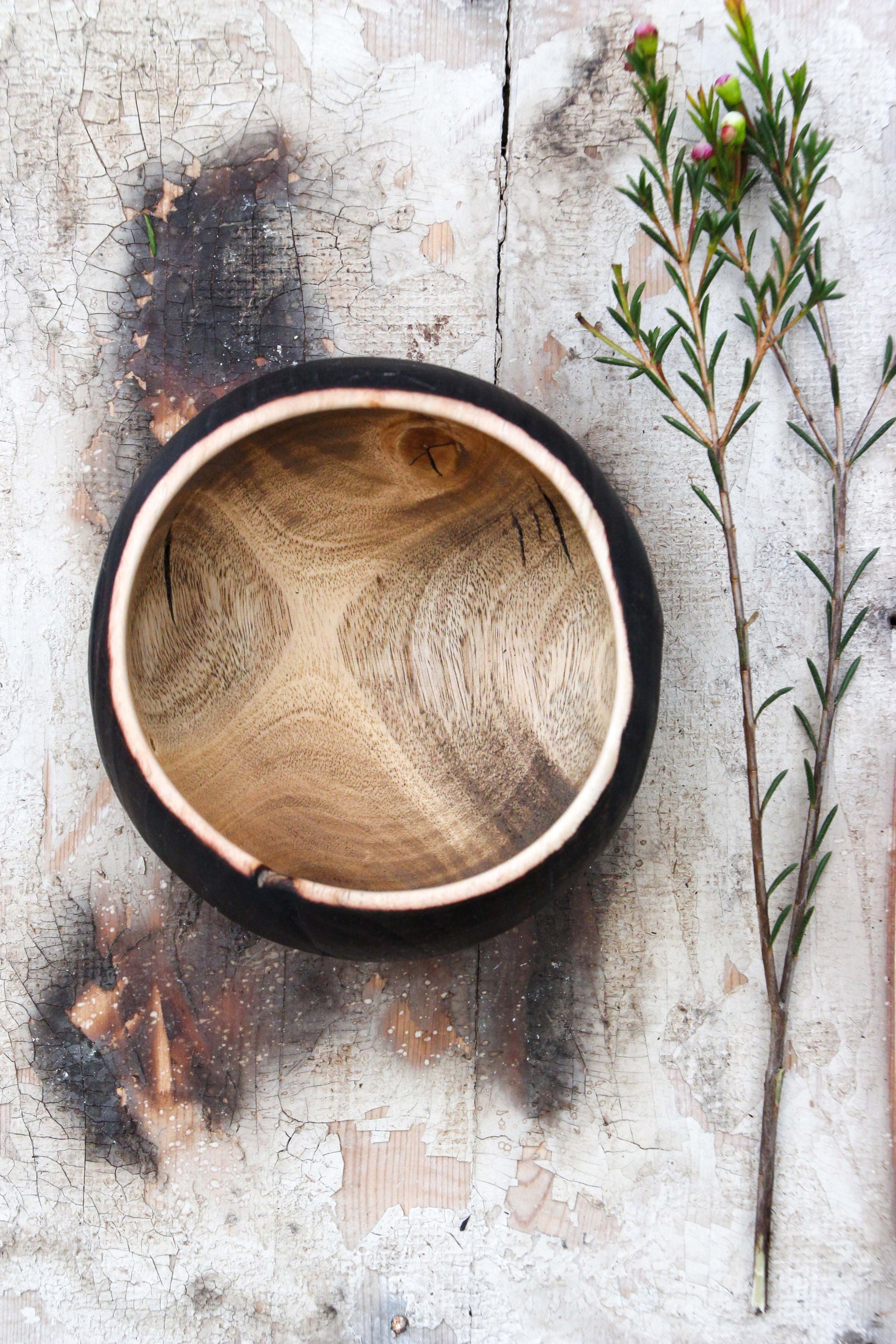 Fire treated on the exterior, leaving the interior to show off its grain. This bowl has changed shape slightly during its drying process as has similarities to half a coconut.