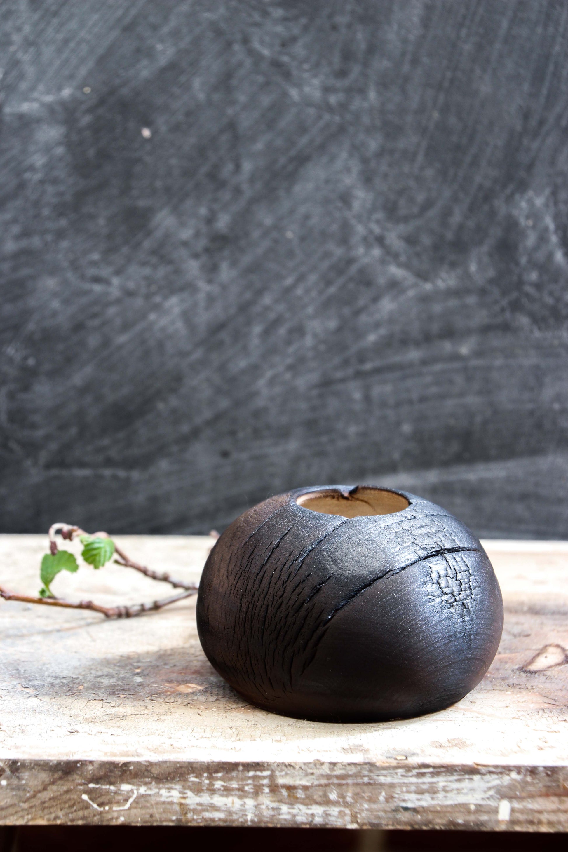 This small hollow form has been charred to the point it has many decorative cracks and a silvery crocodile skin detail.