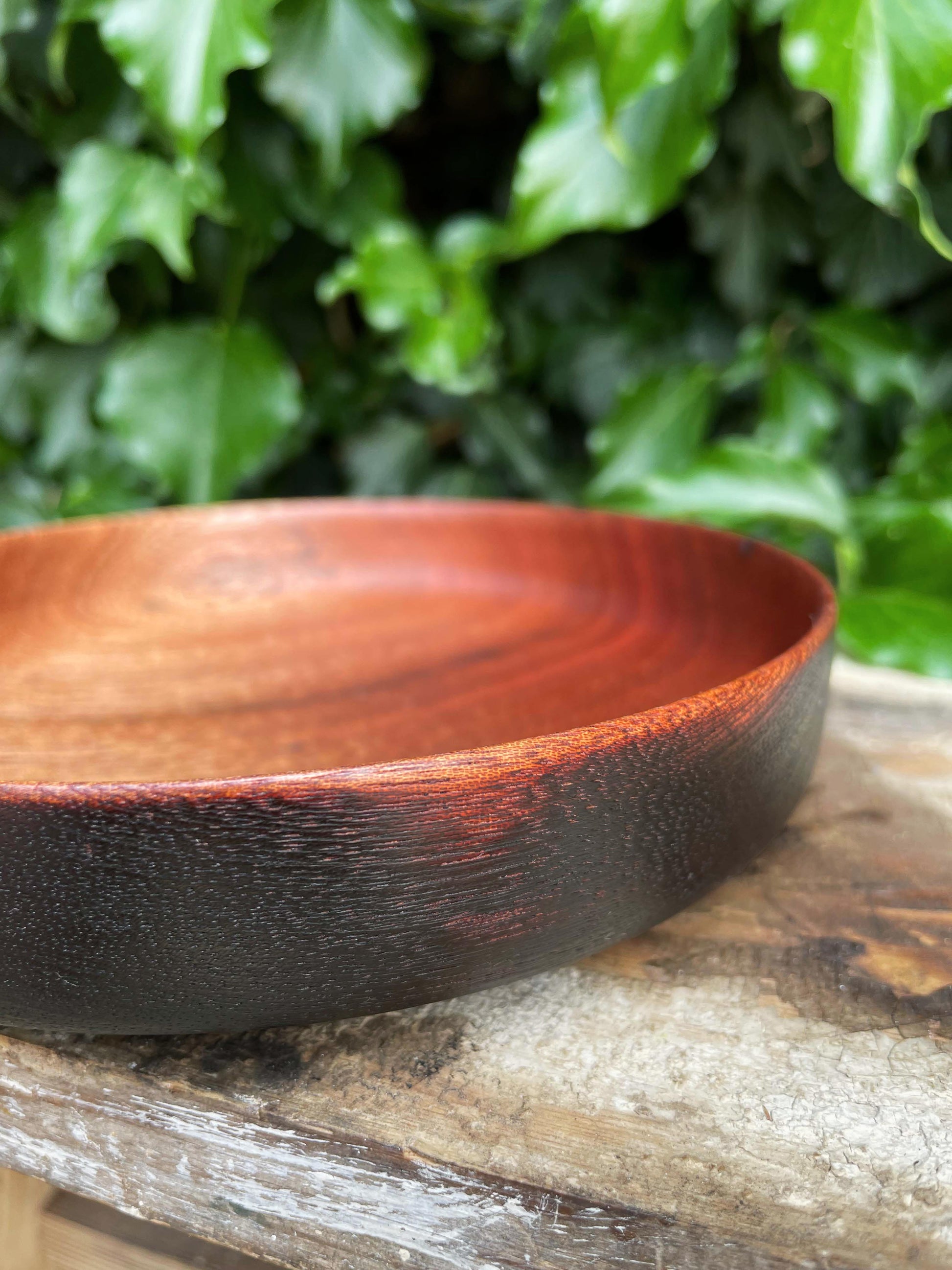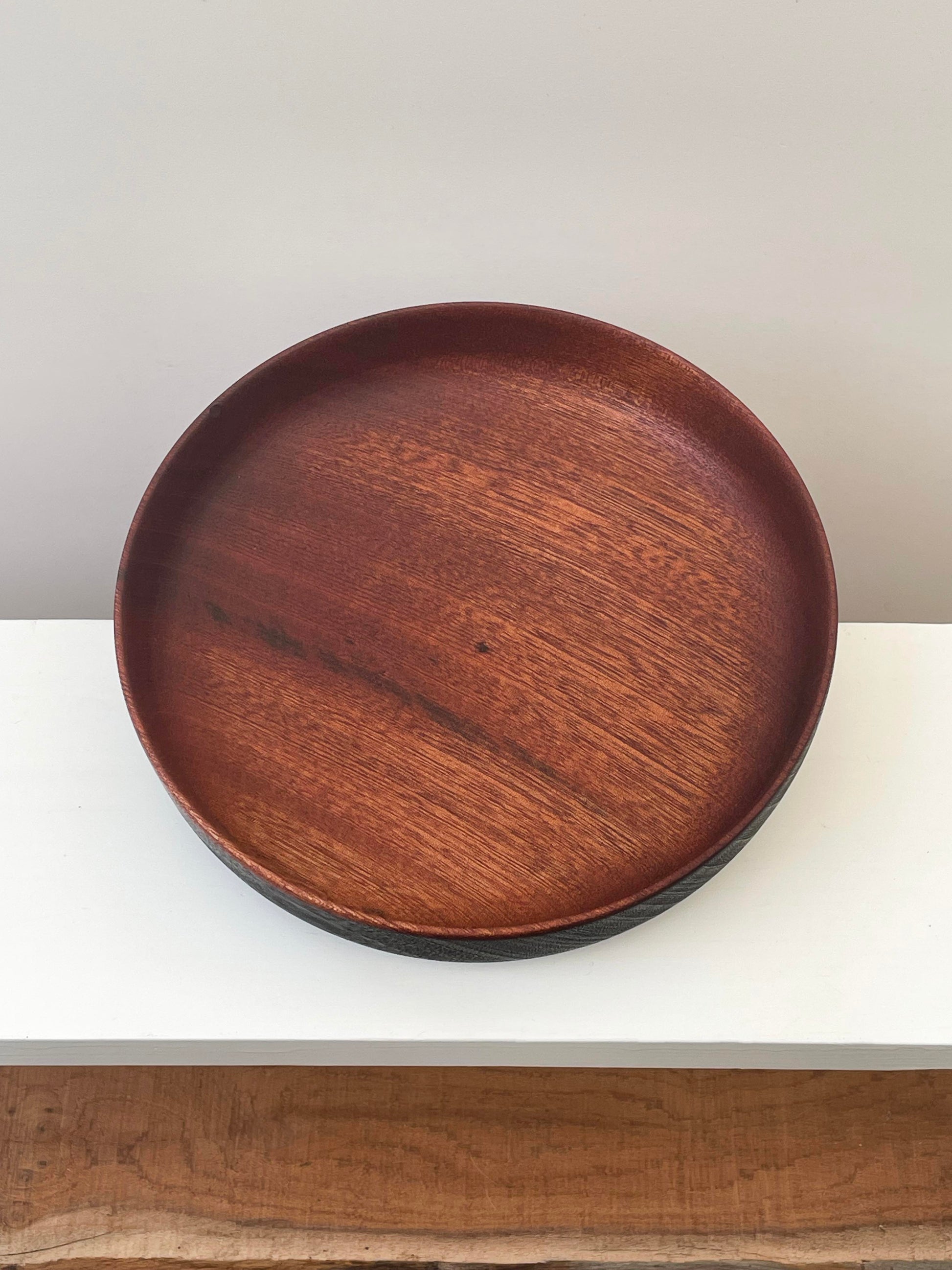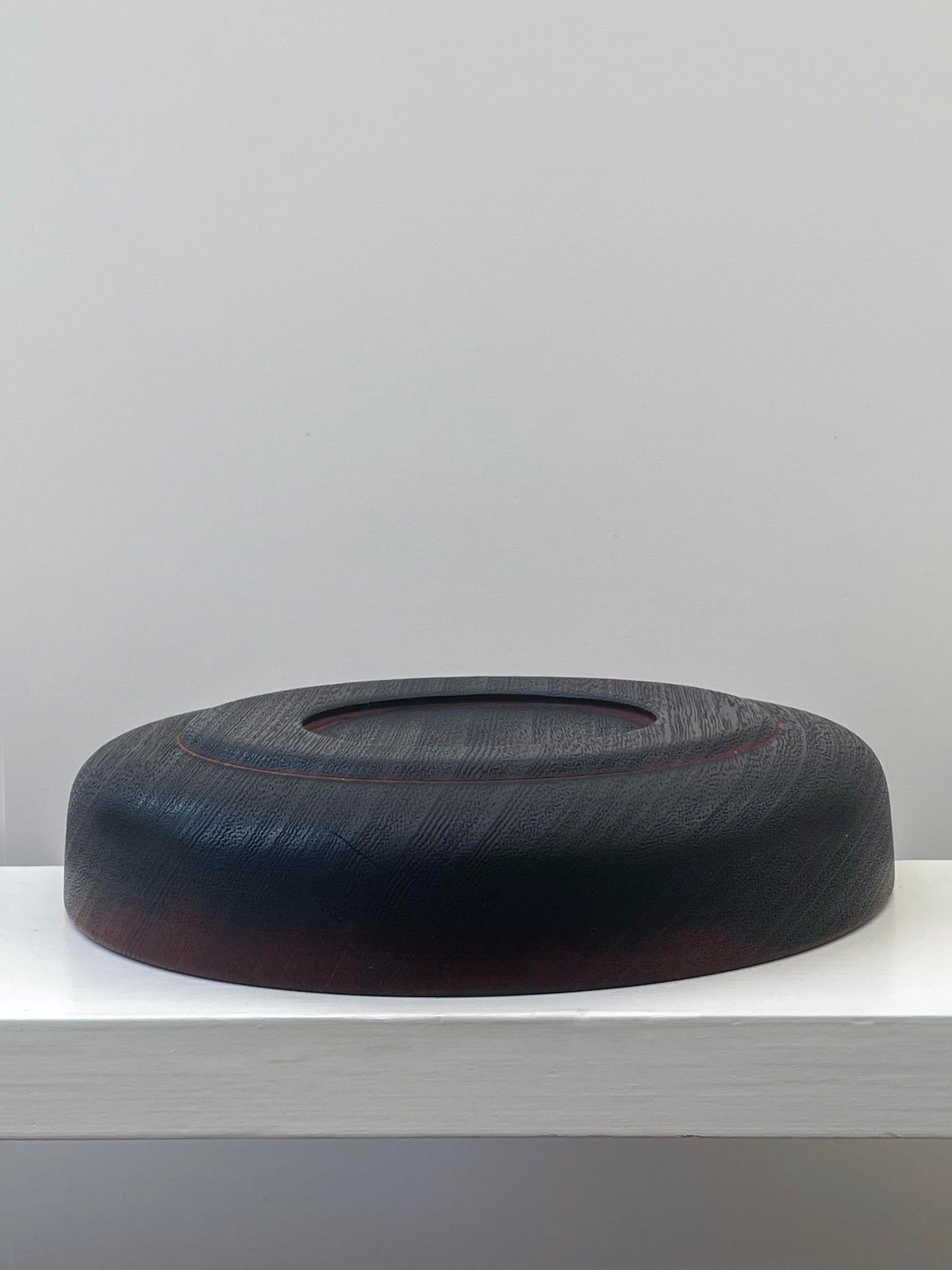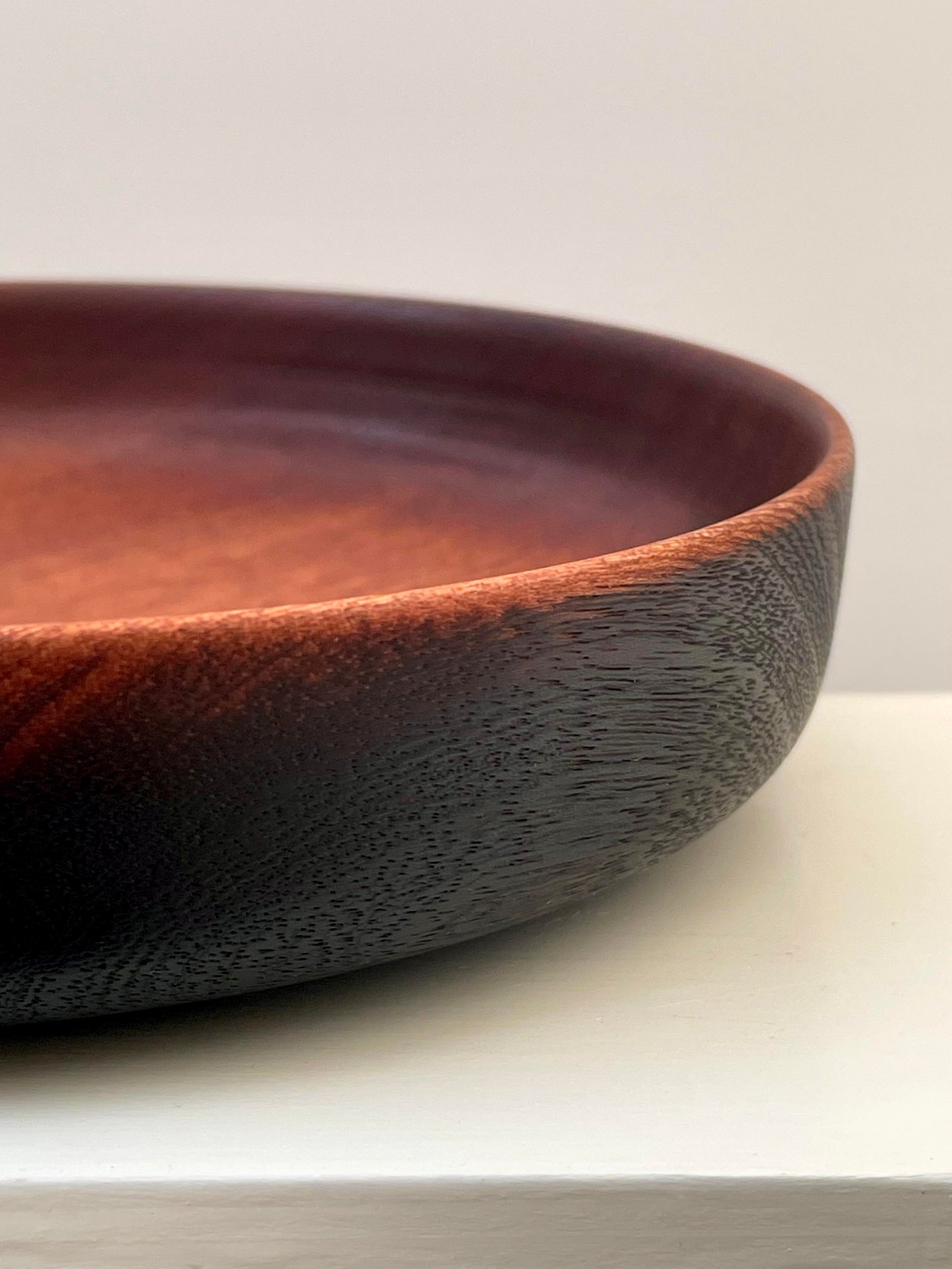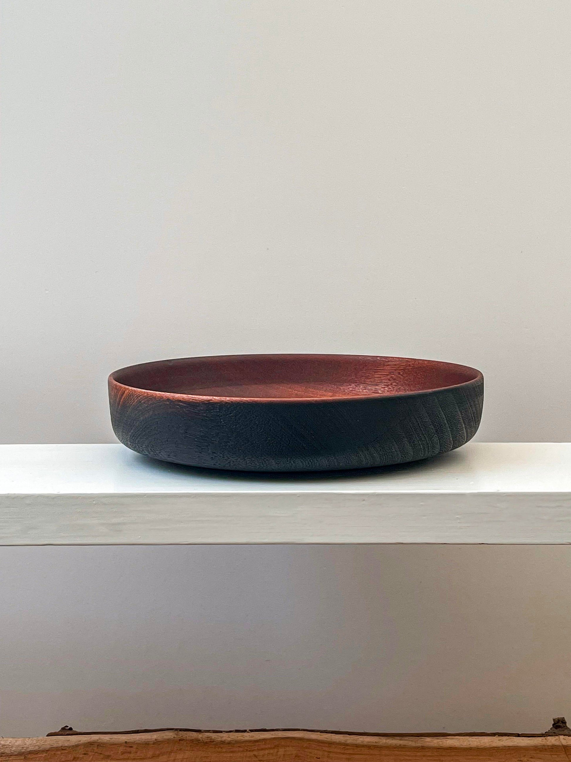 This mahogany bowl has a lovely contrast interior/exterior. Using the Japanese method of wood preservation called yakisugi, the exterior surface was burnt and rubbed back to give its deep black finish.