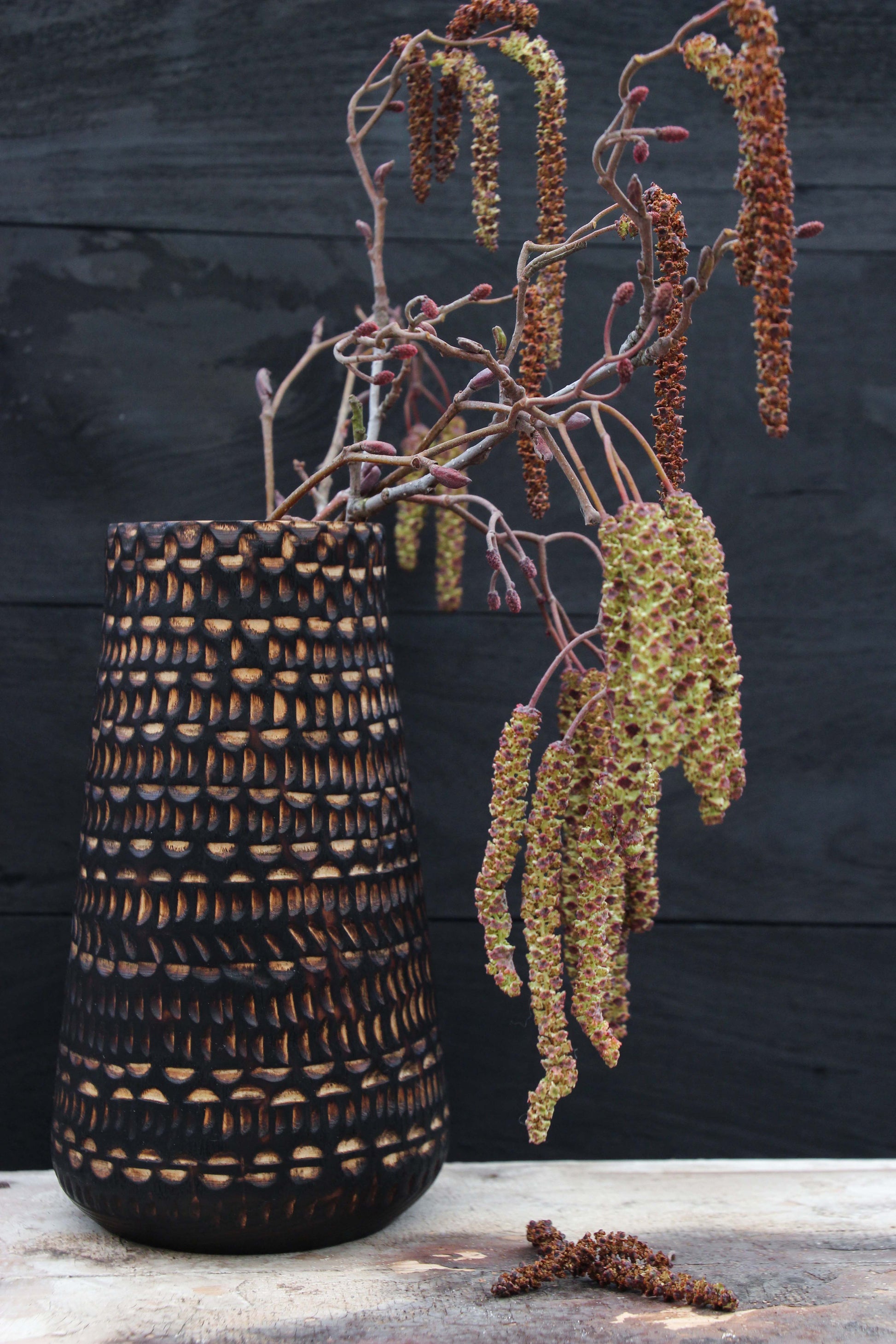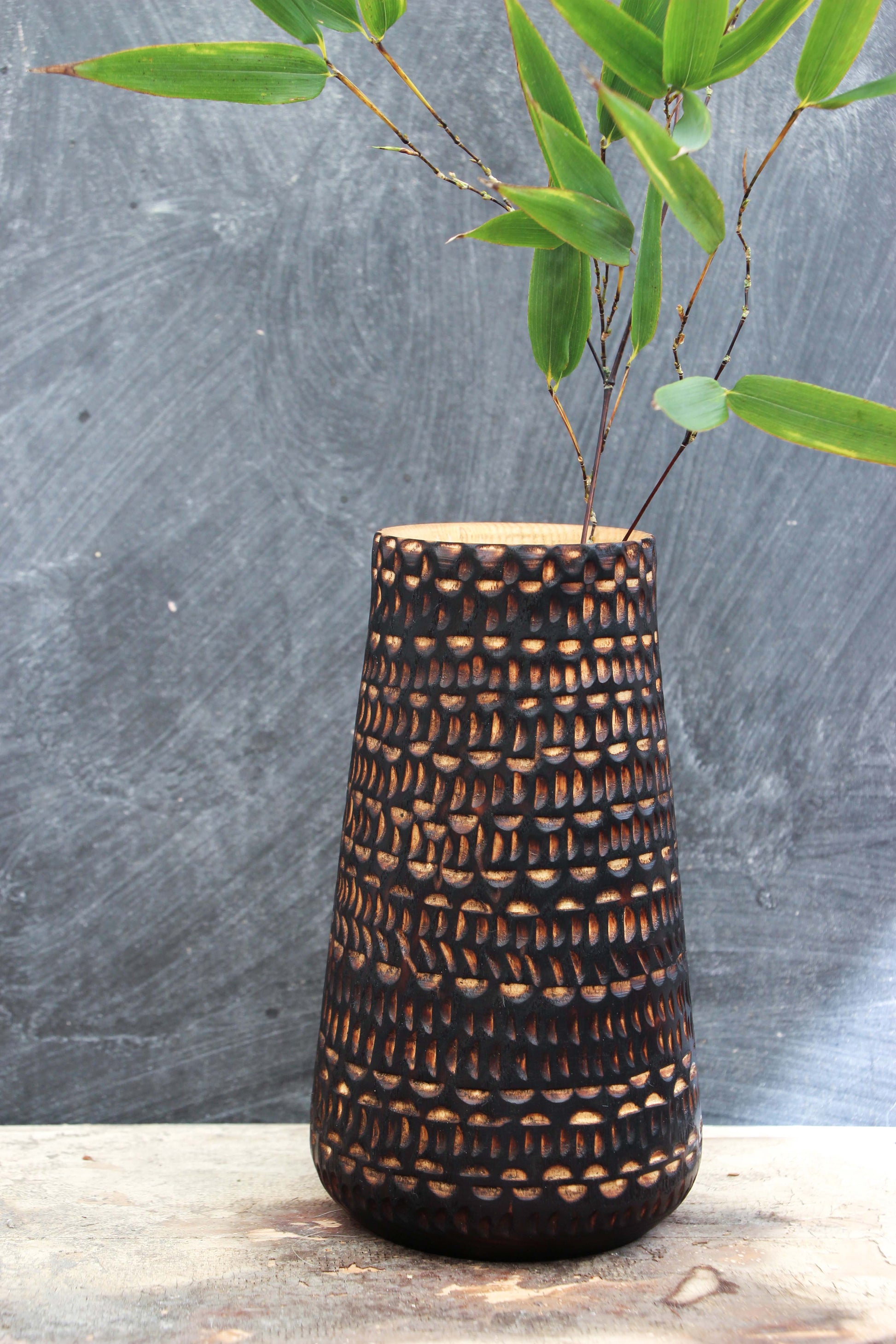 Decorative heavyweight vase in maple with etched surface texture, fire treated and finished with Danish oil.