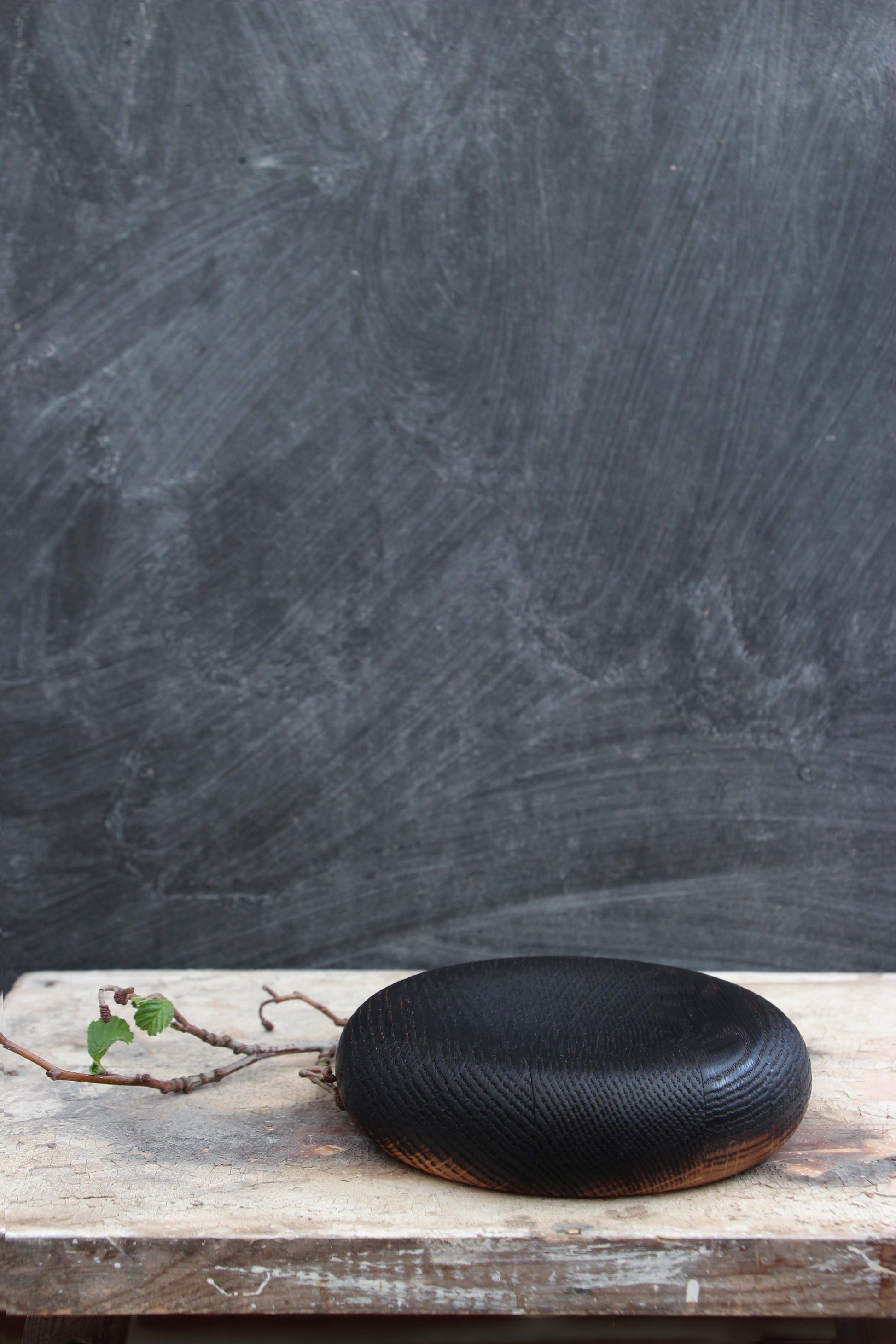 Reclaimed oak worktop, turned into a soft pillow form and top fired treated to darken and bring out the grain texture.