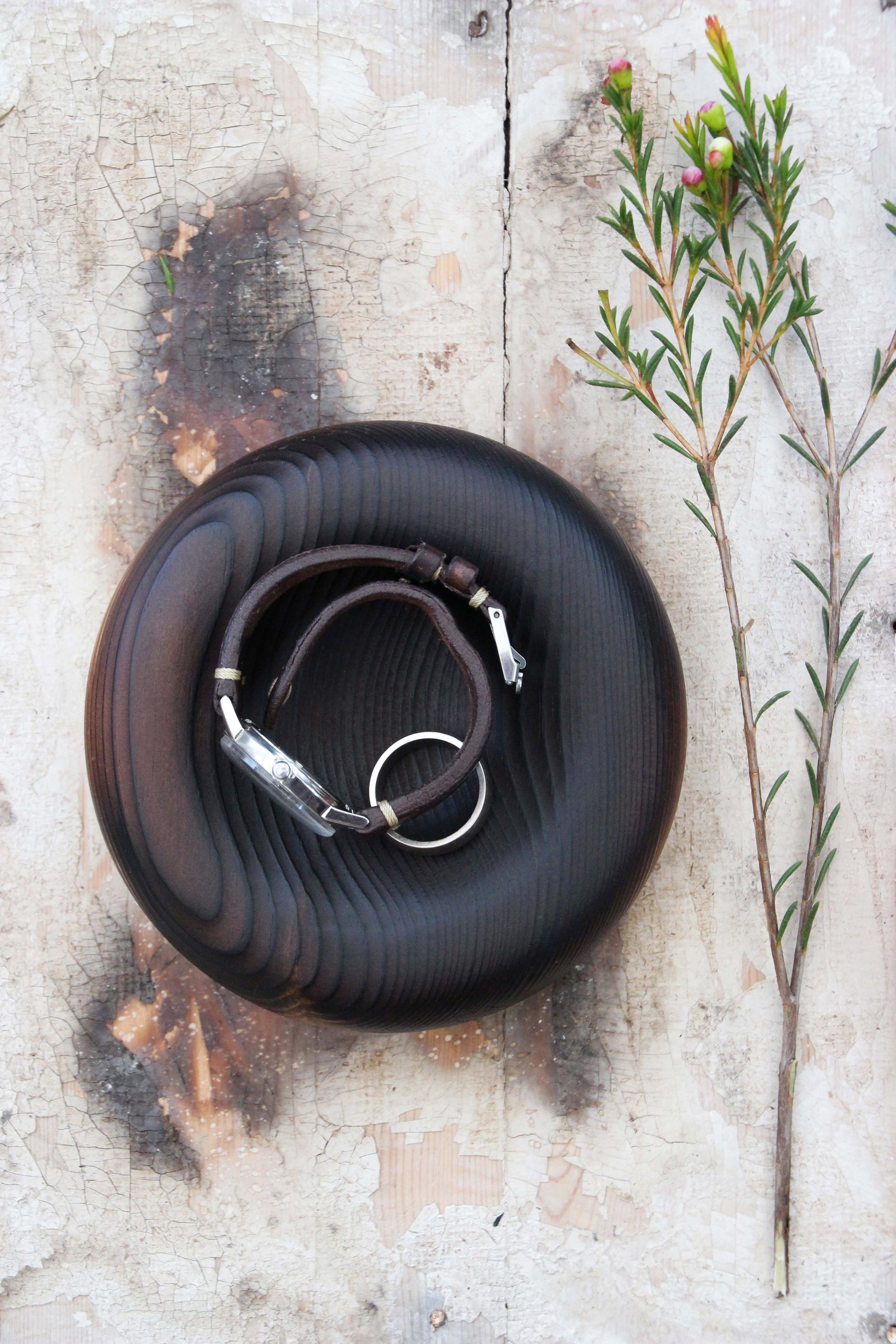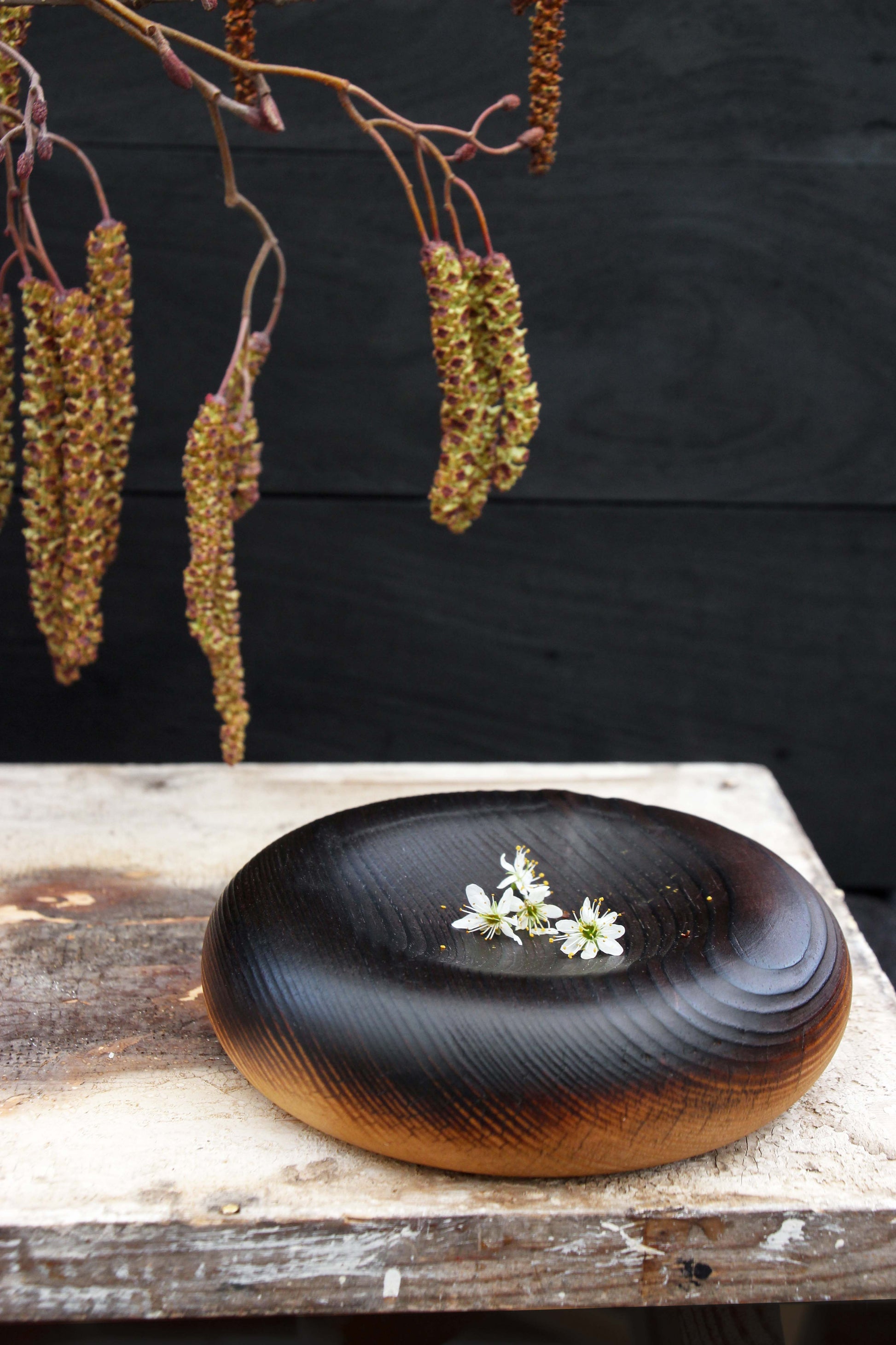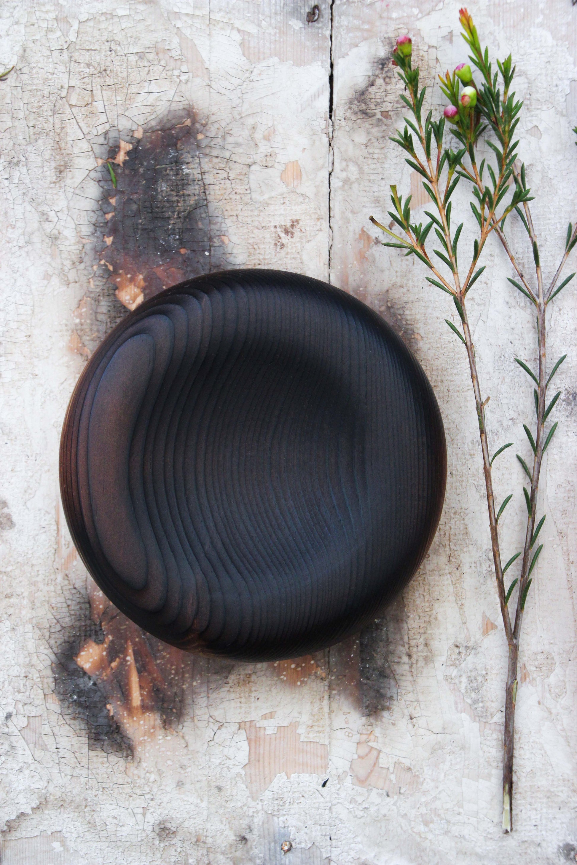 Reclaimed pine turned into a soft pillow form and top fired treated to darken and bring out the grain texture.