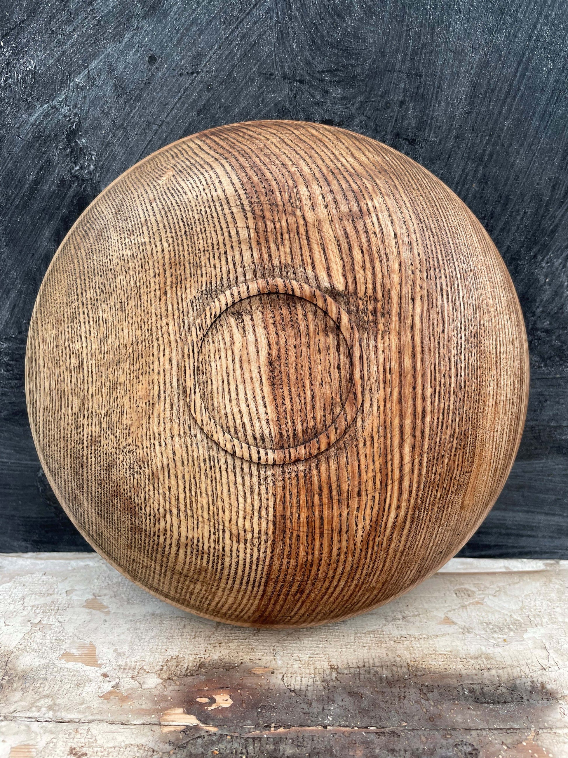 Turned into this low, wide bowl and given a friction burned rim.