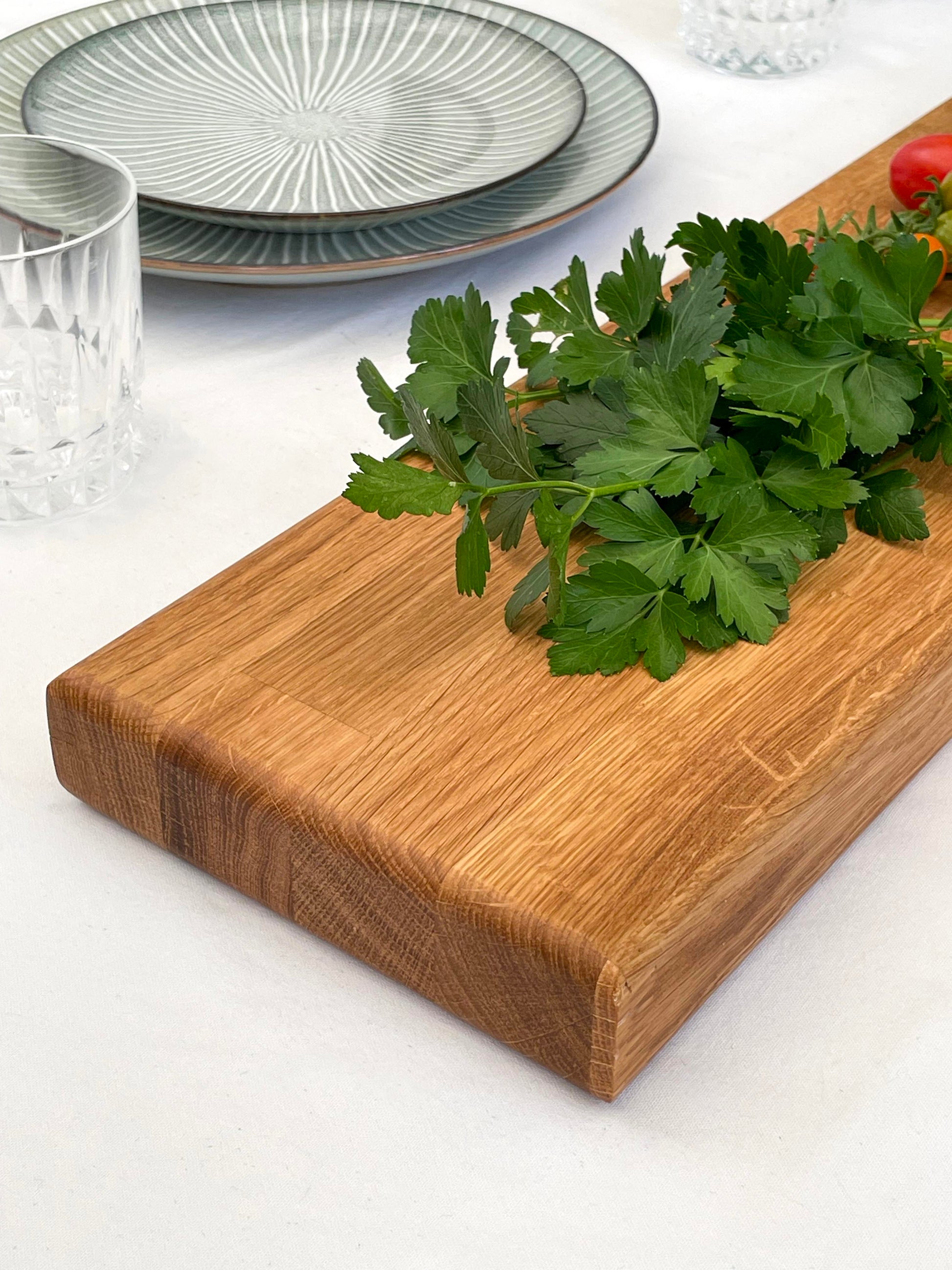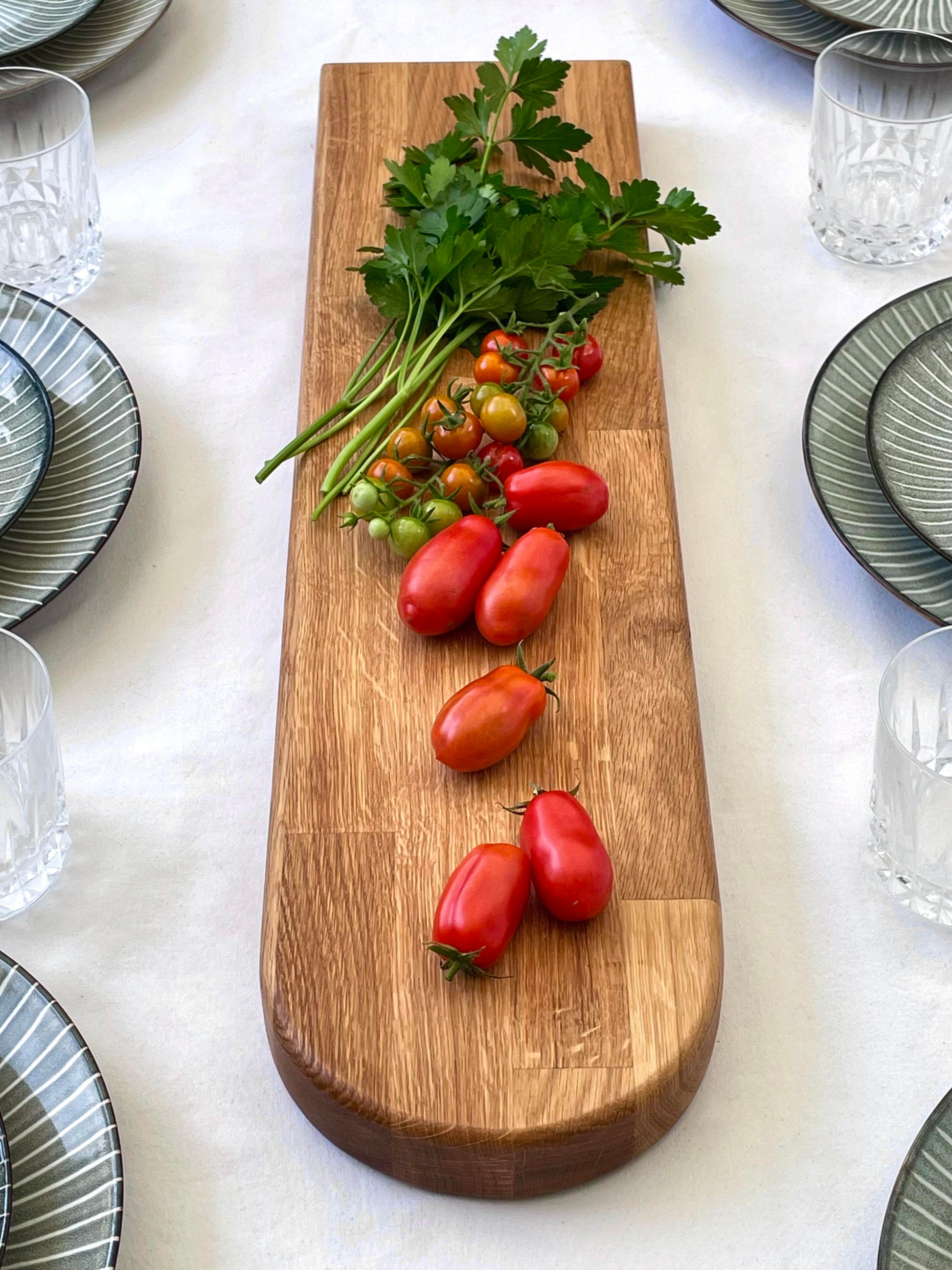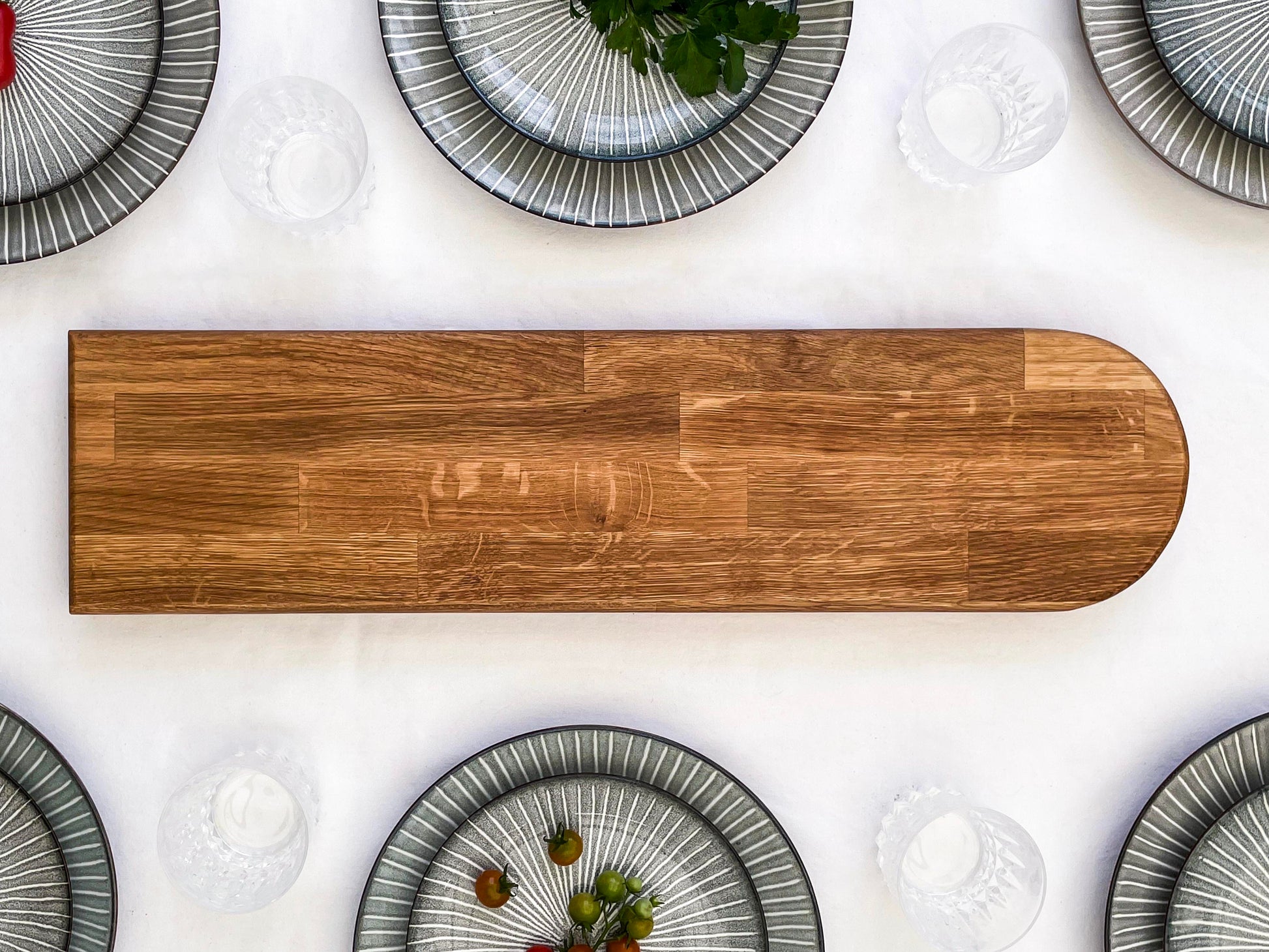 Hand crafted from reclaimed oak worktop. Rustic look board for cheese / charcuterie / hot pots. Curved at one end and squared at the other, reminiscent of retro wooden surf and bellyboards.
