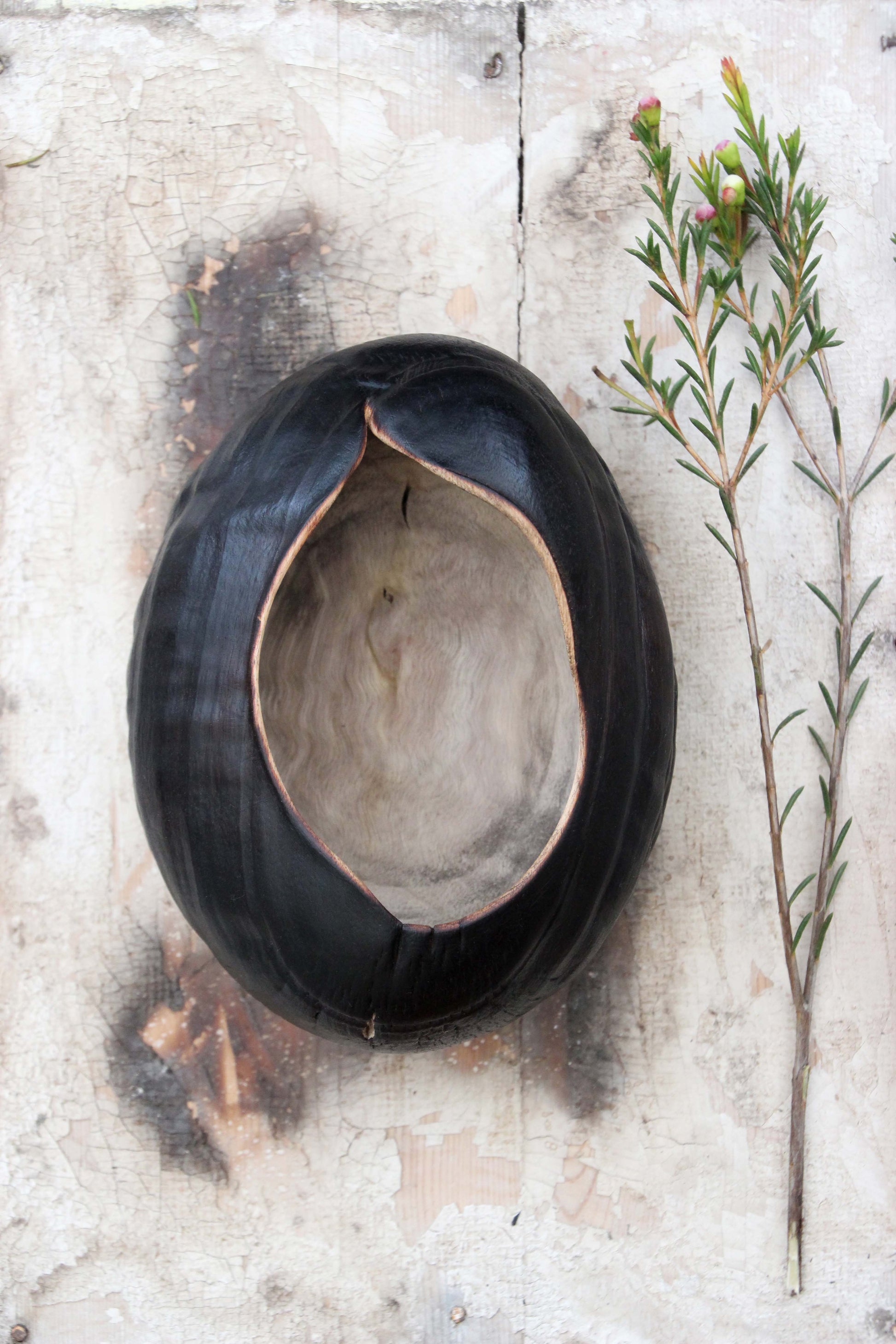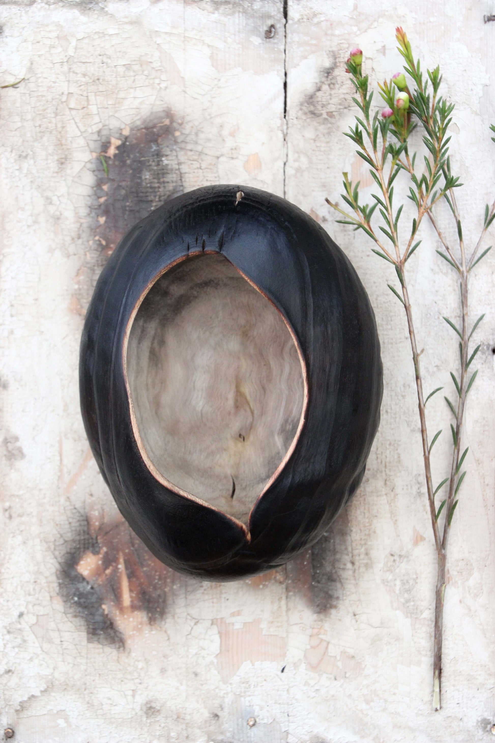 This truly unique eucalyptus hollow form is affectionately known as 'The Nut'. It was turned while the wood was still wet (dripping in fact) and it's hard to believe the original shape was smooth, round and symmetrical.